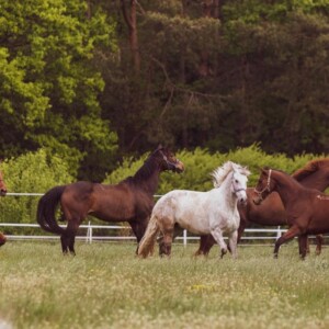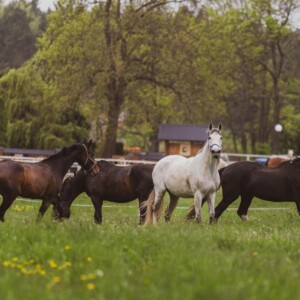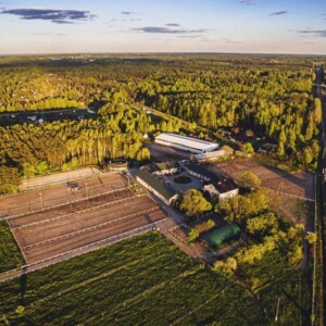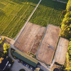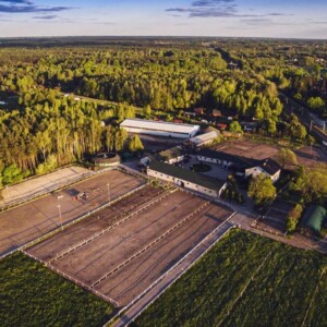 Wiele dużych piaszczystych padoków, kwater, oraz trawiastych wybiegów zlokalizowanych wokół stajni.