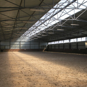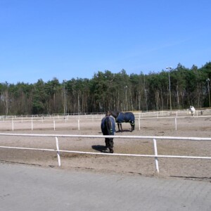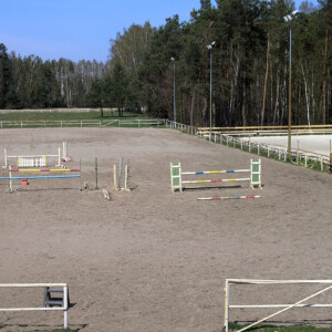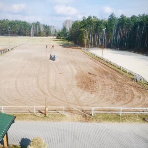 Parkur (40m x 100m) o piaszczystym podłożu, Czworobok (20m x 60m). Oba obiekty oświetlone i automatycznie zraszane.
