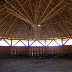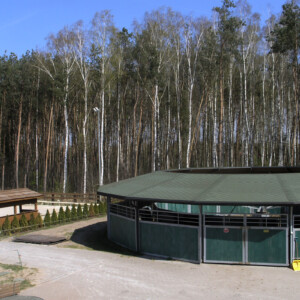 Karuzela 6-cio boksowa o średnicy 18m z podłożem z kostki gumowej. Bezpieczne bandy z litego tworzywa sztucznego.